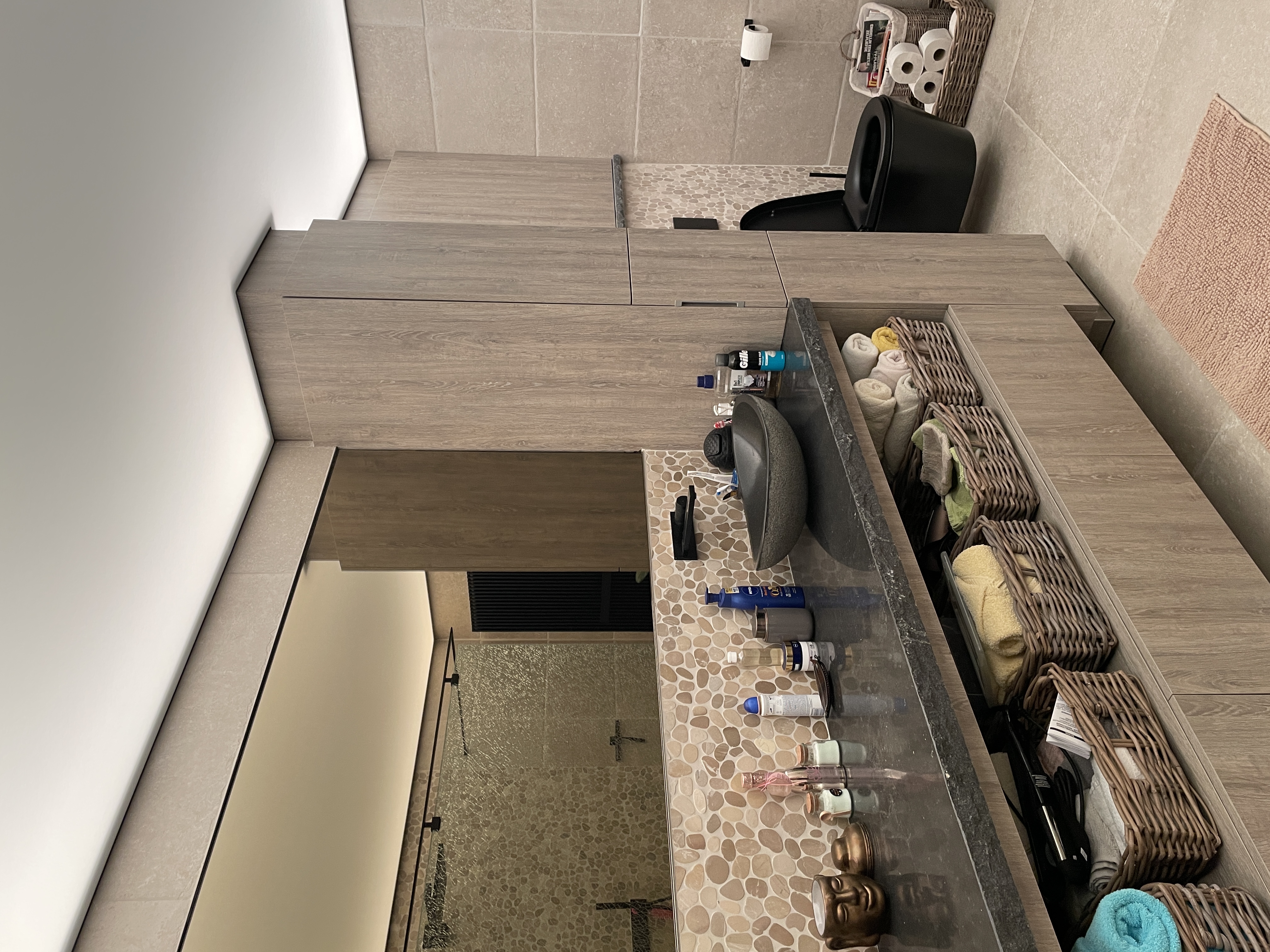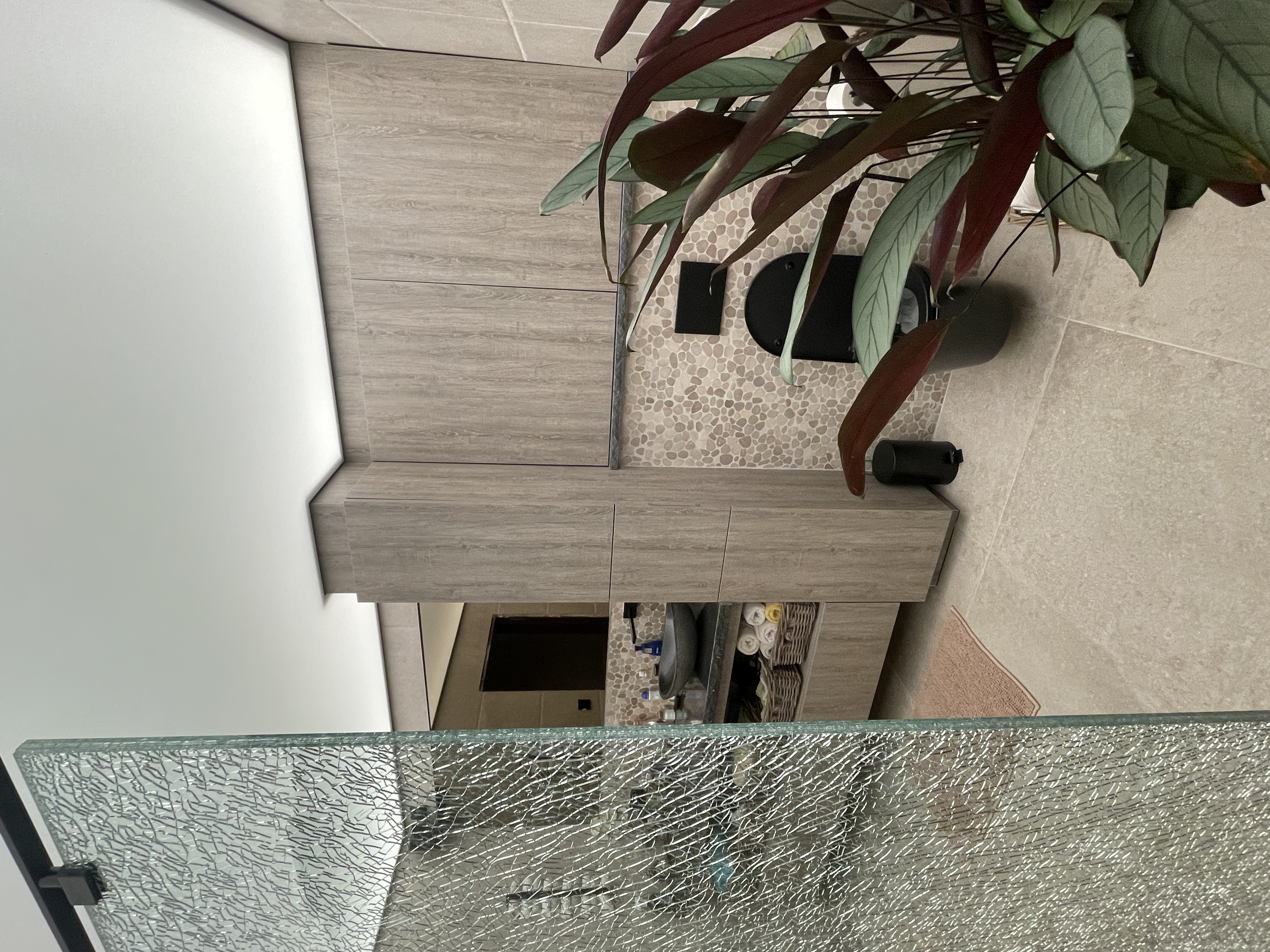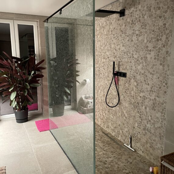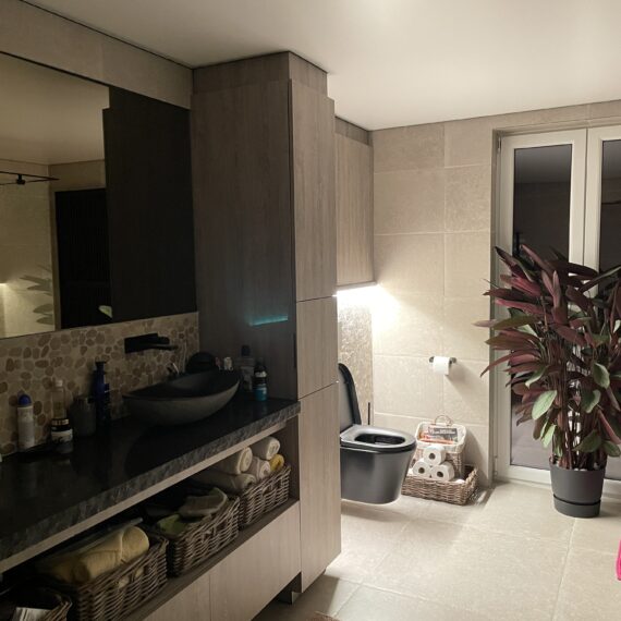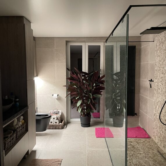 Voor deze badkamerrenovatie in Eernegem hebben we het volledige traject verzorgd, van ontwerp en afbraak tot de eindafwerking. We plaatsten een modern spanplafond met geïntegreerde verlichting, wat de ruimte een open en luxueuze uitstraling geeft. Het tegelwerk werd zorgvuldig aangebracht voor een stijlvolle en duurzame afwerking. De sanitaire installaties werden volledig vernieuwd en een nieuw raam werd geplaatst om meer natuurlijke lichtinval te creëren. Daarnaast zorgden op maat gemaakte meubels voor een perfecte balans tussen esthetiek en functionaliteit. Het resultaat is een hoogwaardige, comfortabele en moderne badkamer.