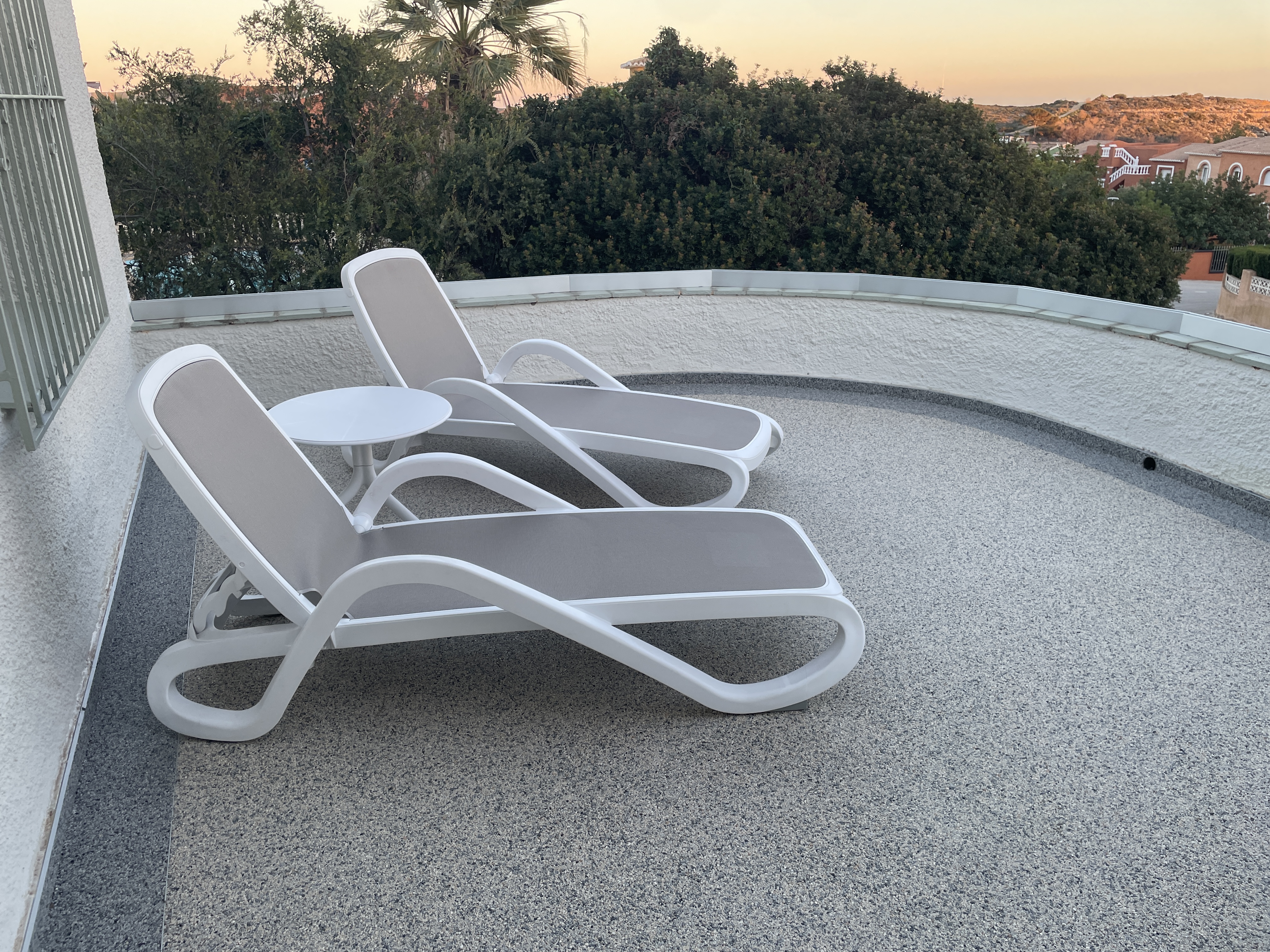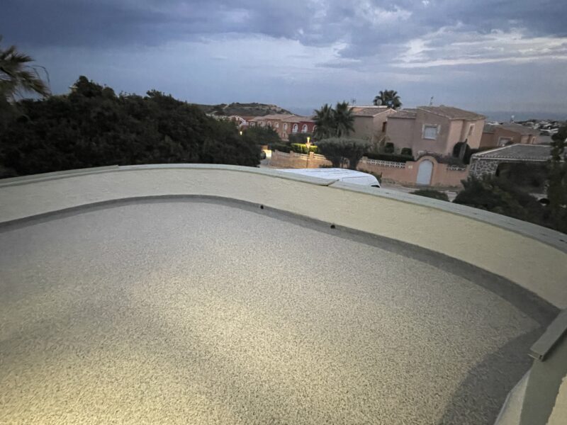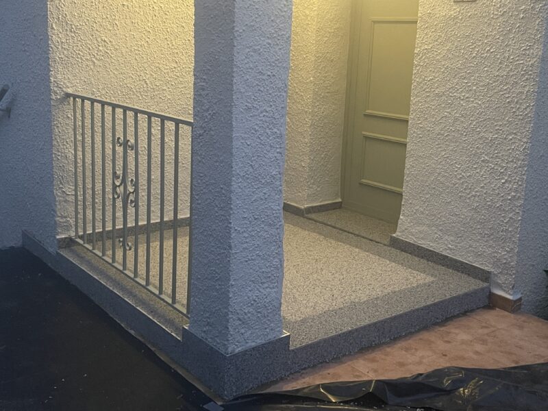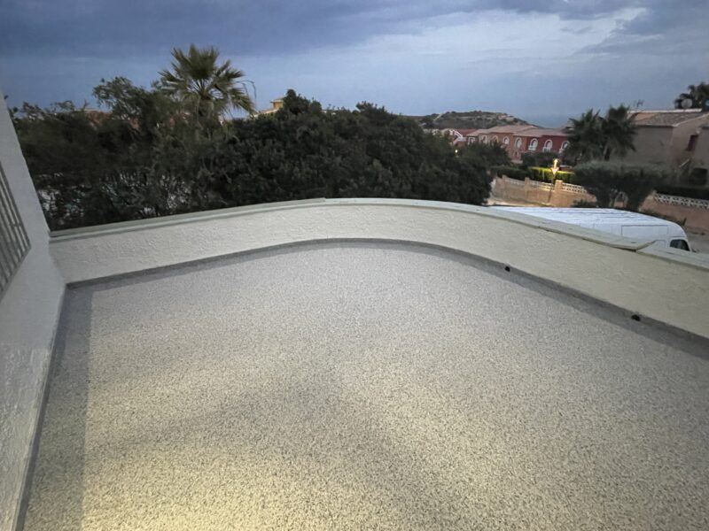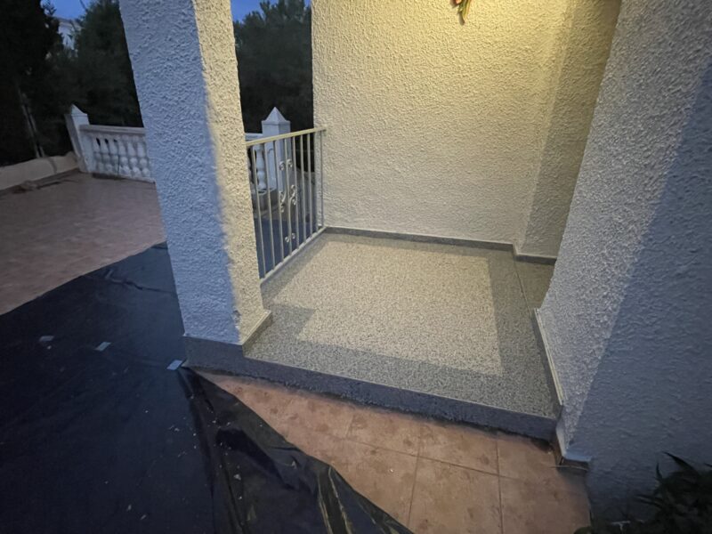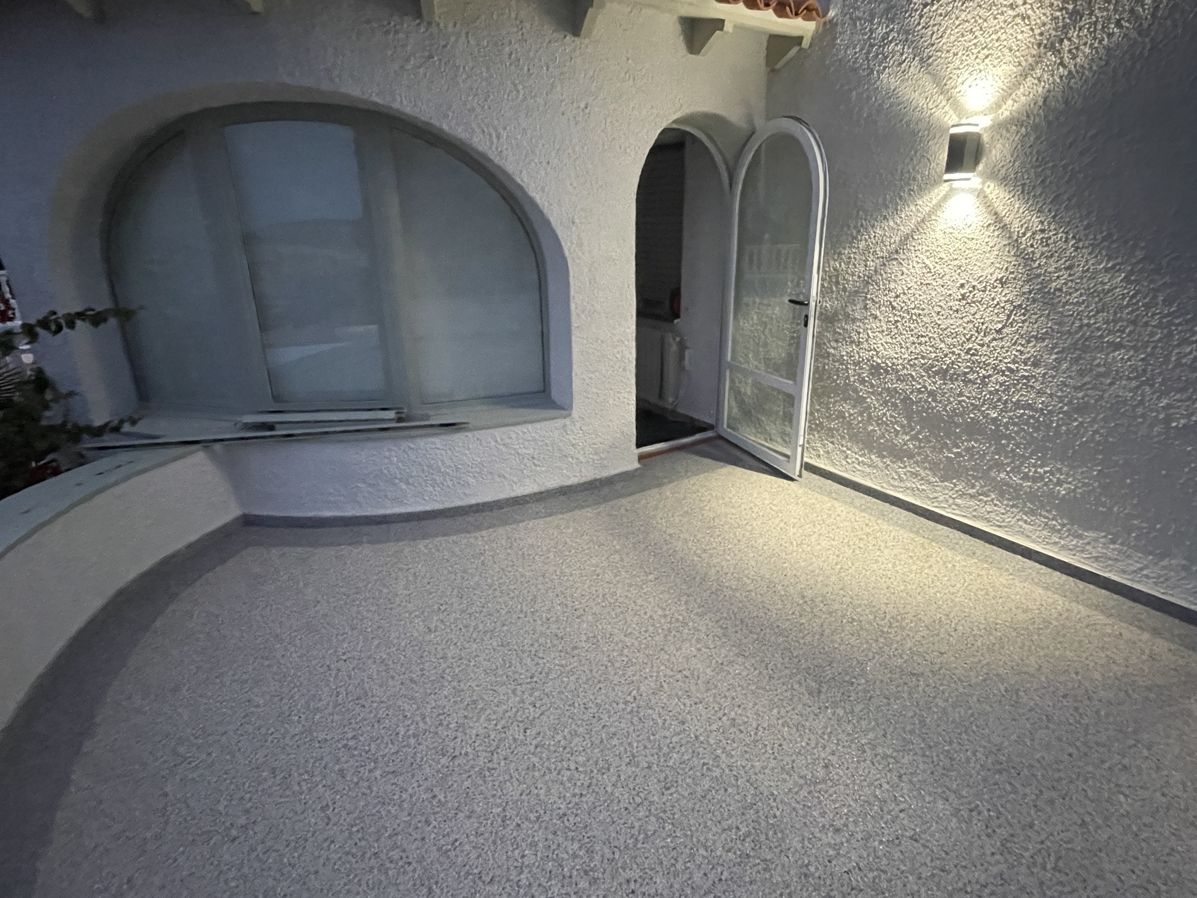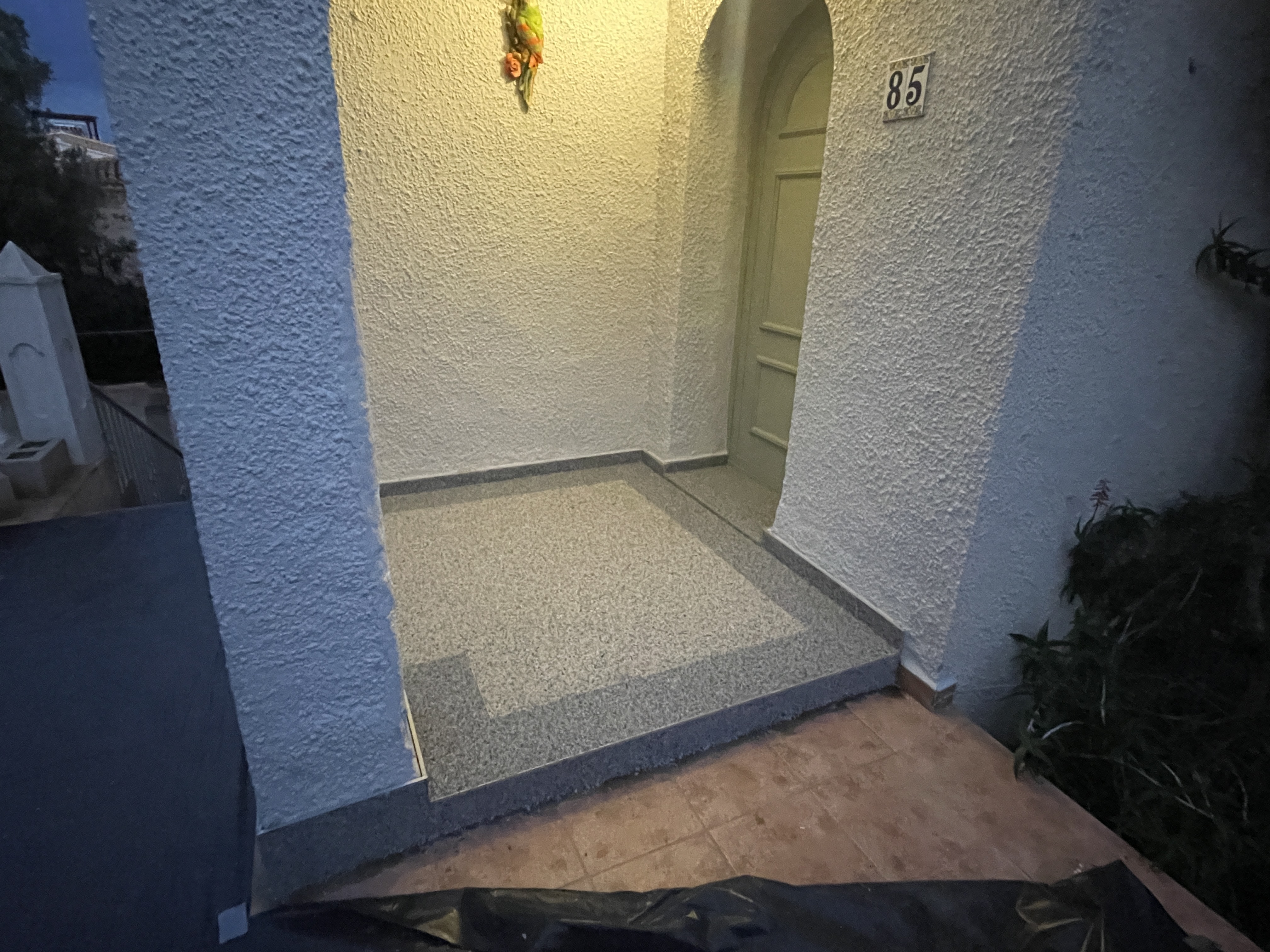 Voor dit project in Costa Blanca hebben we steentapijt geplaatst op het dakterras en het inkomportaal. Dit slijtvaste en waterdoorlatende materiaal is perfect geschikt voor het warme klimaat en biedt een stijlvolle, naadloze afwerking. Op het dakterras zorgt het voor een comfortabele en onderhoudsvriendelijke vloer, ideaal om te genieten van het uitzicht en het mediterrane weer. Bij het inkomportaal creëert het een elegante entree die zowel duurzaam als antislip is. Dankzij deze hoogwaardige afwerking combineert het project esthetiek met functionaliteit.